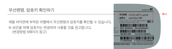 제품 바닥면에 부착된 라벨에서 무선랜명과 암호키를 확인할 수 있습니다.