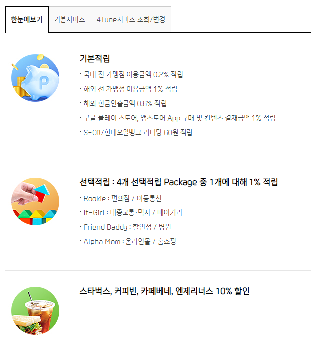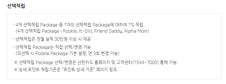 (4개 선택적립 Package : Rookie, It-Girl, Friend Daddy, Alpha Mom) - 선택적립은 전월 실적 30만원 이상 시 제공