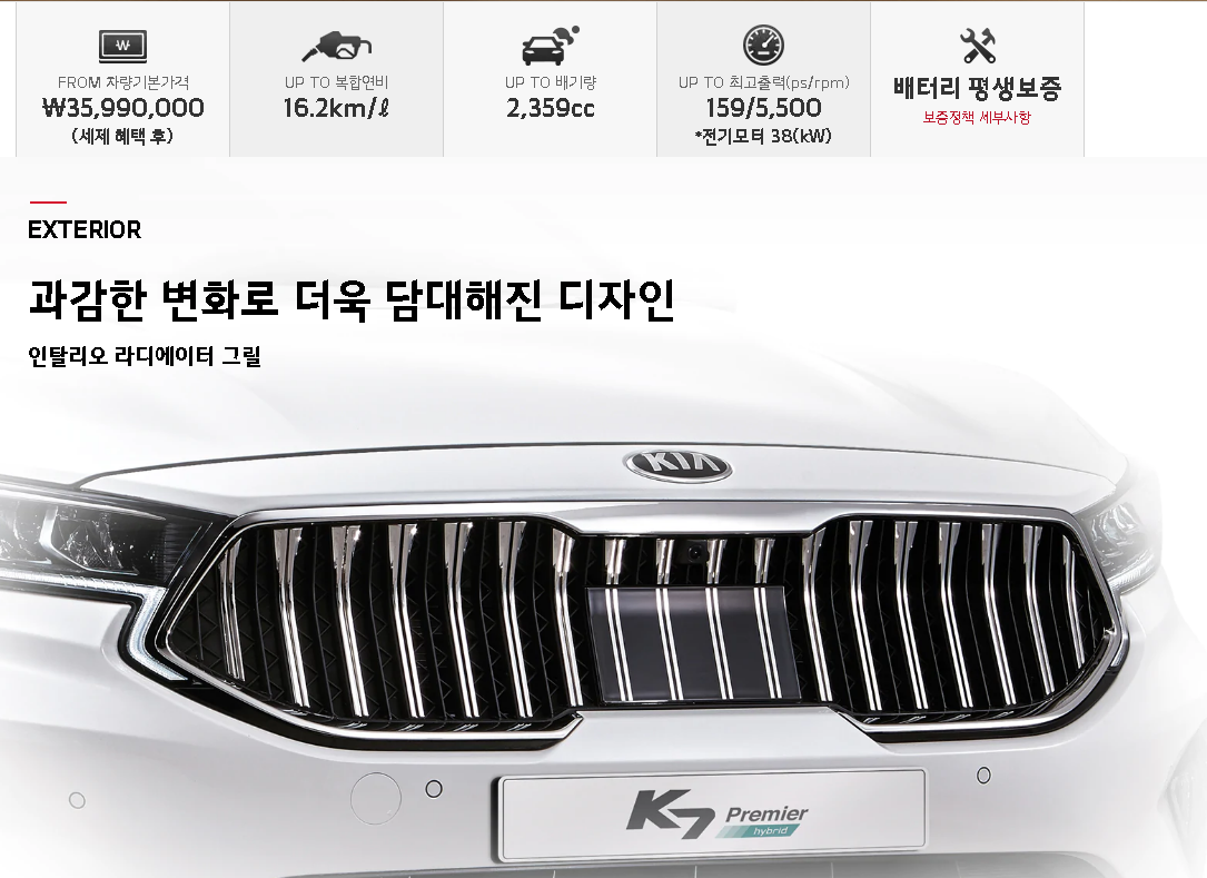 • 하이브리드 시스템 : 38kW 하이브리드 모터, 차세대 회생제동 브레이크 시스템,