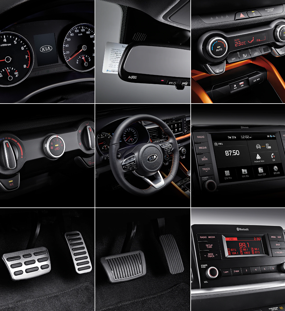7인치 UVO 내비게이션, 후방 모니터, 샤크핀 안테나, 풀오토 에어컨, 반광크롬 인사이드 도어핸들, 블랙하이그로시 센터 콘솔 커버