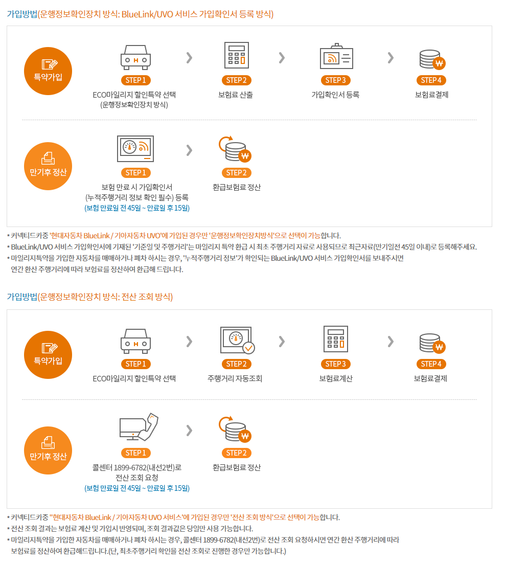 - 현대해상 어플리케이션 → 전체메뉴 → 계약 → ECO마일리지특약 가입 (공인인증 필요)