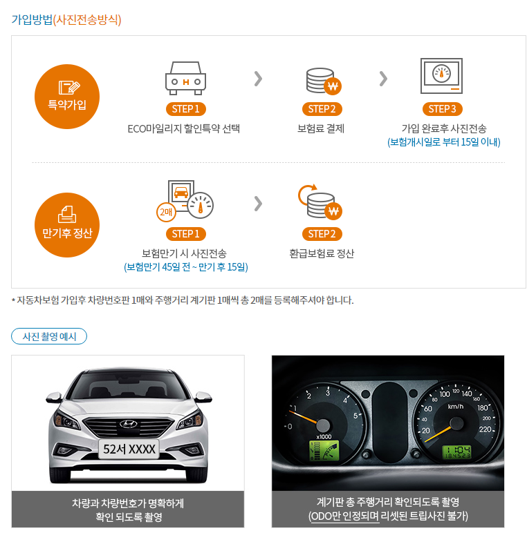 - 현대해상 다이렉트 홈페이지(direct.hi.co.kr) : 보험가입완료 화면내 '마일리지특약 사진등록'클릭 → PC등록 및 모바일 등록 선택 → 사진전송