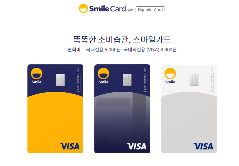 - 스마일카드 연회비는 국내전용 5천원 , 국내외겸용(VISA) 8천원입니다.