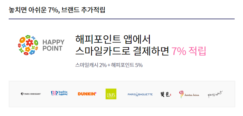 스마일카드로 결제하면 7% 적립스마일캐시 2% + 해피포인트 5%