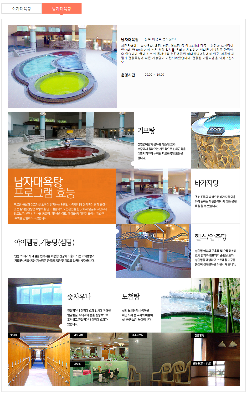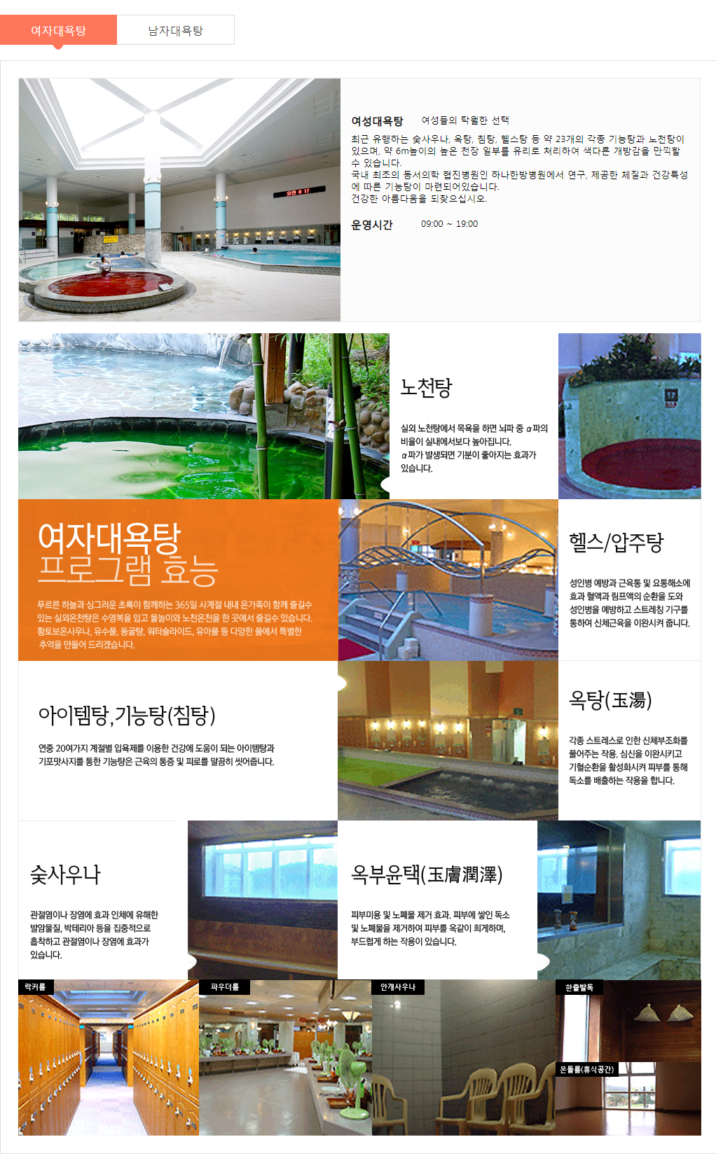 | 종합시설 | 바데풀 : 수중 마사지가 가능한 바데풀과 어린이용 키즈풀 실외온천풀 : 사계절, 365일 즐길 수 있는 온천풀 방갈로 : 독립적으로 휴식을 취할 수 있는 공간 피쉬테라피탕 : 각질제거 및 피부마사지 체험탕 여자온천탕 : 다양한 이벤트탕, 사우나 도크, 노천탕, 온돌품, 맥반석찜질 남자온천탕 : 다양한 이벤트탕, 사우나 도크, 노천탕 워터파크 : 가족, 연인, 친구와 함께 즐기는 다양한 놀이시설 . 슬라이드(튜브, 레이스, 바디) / 실외 아쿠아플레이 / 파도풀 (동시 1,000명 수용가능) |