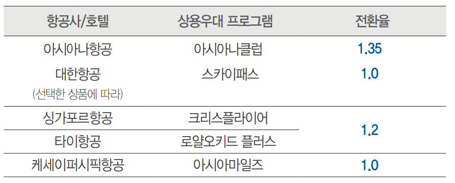- 씨티 프리미어마일의 항공사 별 마일리지 전환율은 각 항공사와의 제휴계약 및 시장상황을 감 안하여 당행 내부정책으로 정한 사항이며, 각 항공사의 마일리지 현금가치를 판단하는 객관적 기준으로 사용될 수 없습니다.