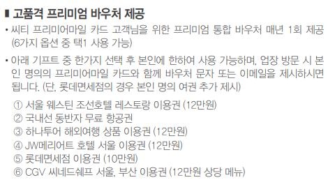 •씨티 프리미어마일 카드 고객님을 위한 프리미엄 통합 바우처 매년 1회 제공 (6가지 옵션 중 택1 사용 가능)
