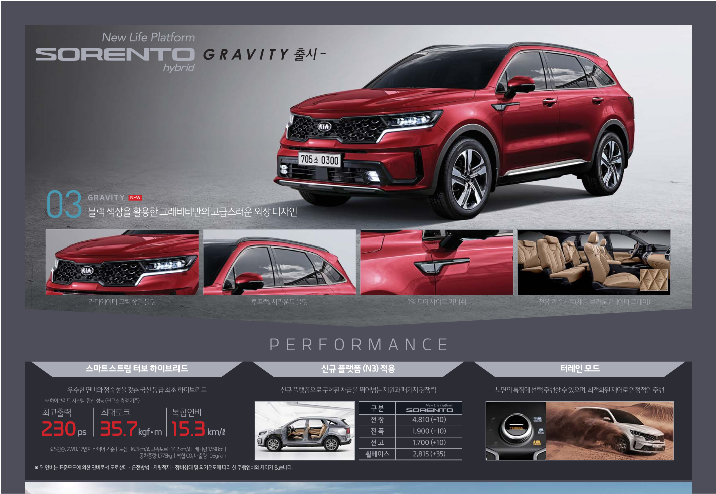■ 외장 : 그래비티 전용 외장 디자인, 프로젝션 LED 헤드램프, 프론트 LED 턴시그널 램프, 235/55 R19 컨티넨탈 타이어 & 전면가공 휠