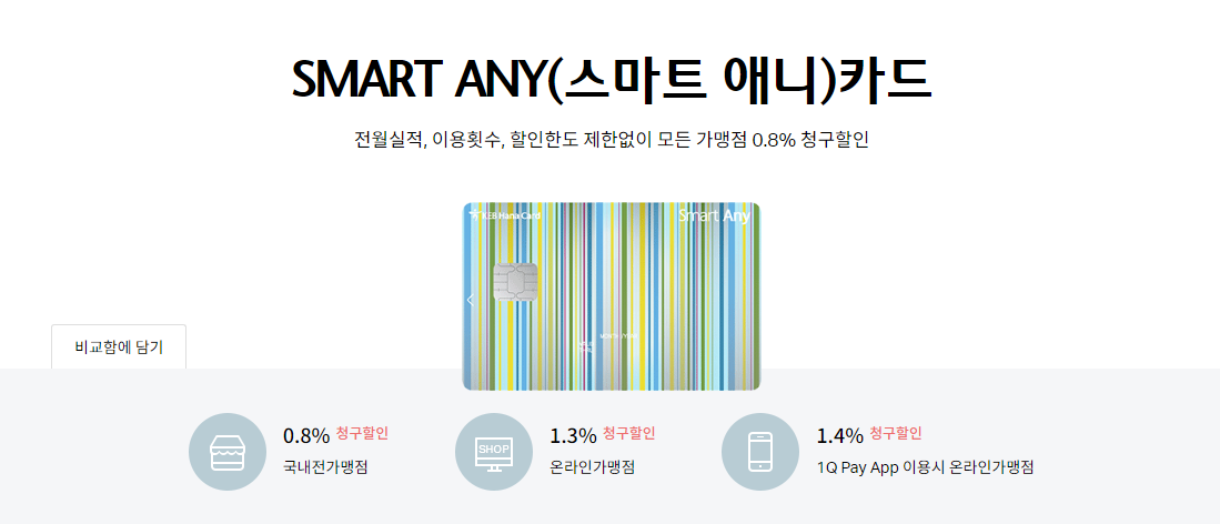 - 모든 가맹점 0.8% 할인 + 온라인 가맹점 0.5% 추가 할인 → 온라인 가맹점은 총 1.3% 청구할인