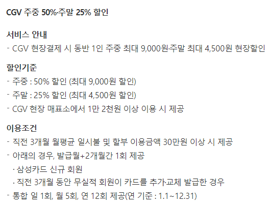 - CGV 현장결제 시 동반 1인 주중 최대 9,000원·주말 최대 4,500원 현장할인