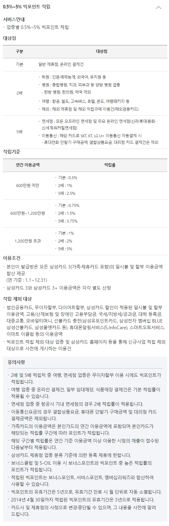 - 빅포인트 적립 제외 대상 업종 및 삼성카드 홈페이지 등을 통해 신규사업 적립 제외 대상으로 사전에 게시하는 이용건