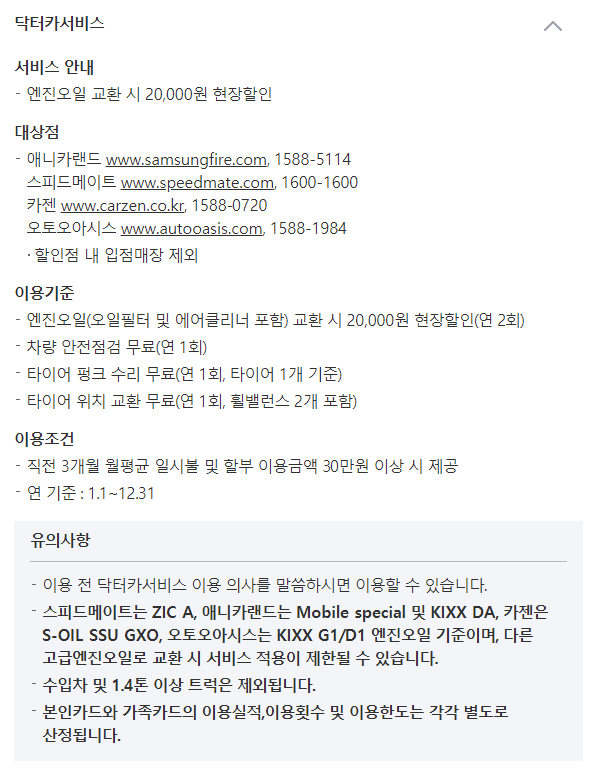 - 스피드메이트는 ZIC A, 애니카랜드는 Mobile special 및 KIXX DA, 카젠은 S-OIL SSU GXO, 오토오아시스는 KIXX G1/D1 엔진오일 기준이며, 다른 고급엔진오일로 교환 시 서비스 적용이 제한될 수 있습니다.