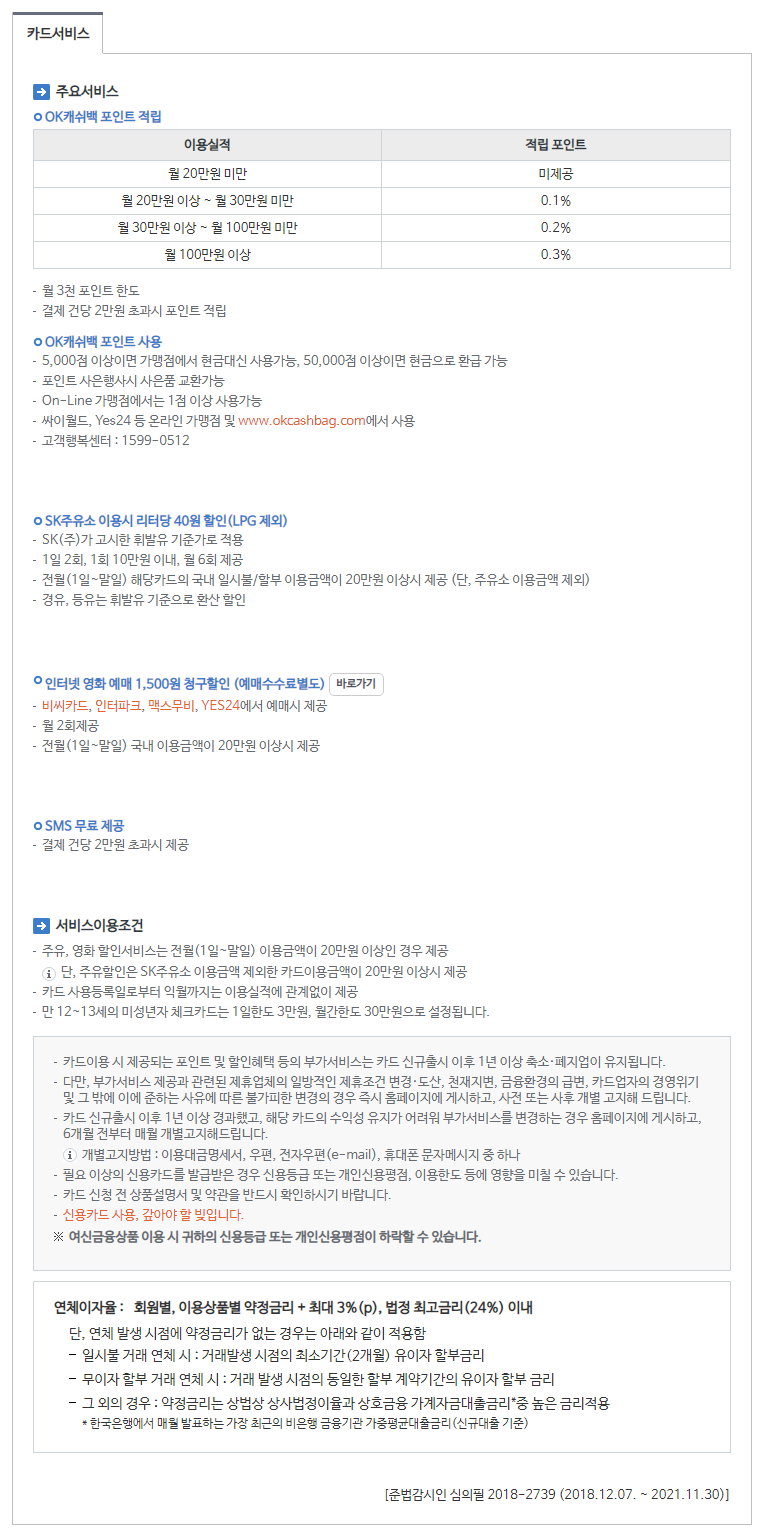 최대 0.3% OK캐쉬백 포인트 적립,SK주유소 리터당 40원 할인(LPG제외)