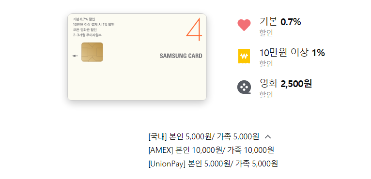- 모든 가맹점 10만원 이상 결제 시 1% 결제일할인(청구할인)