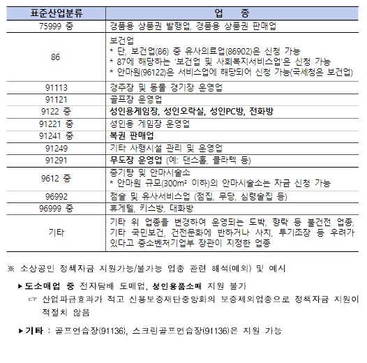다만, 융자제외 업종 중 유흥주점과 콜라텍은 코로나19 확산방지를 위해 시행한 집합금지 업종에 해당되어 지원대상입니다