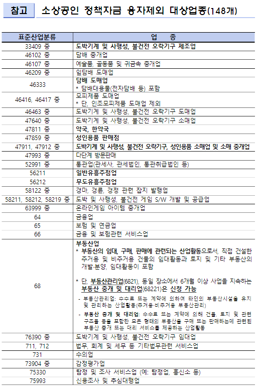 지원대상(①집합금지업종, ②영업제한업종, ③일반업종)에 해당되더라도, 사행성 업종, 변호사,회계사, 병원 등 전문직종, 부동산 임대업 등 소상공인 정책자금 융자제외 대상업종은 지원대상에서 제외됩니다.