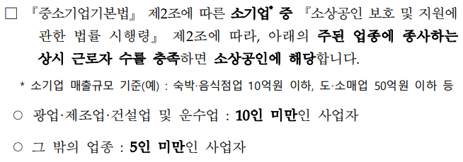 『중소기업기본법』 제2조에 따른 소기업* 중 『소상공인 보호 및 지원에 관한 법률 시행령』 제2조에 따라, 아래의 주된 업종에 종사하는 상시 근로자 수를 충족하면 소상공인에 해당합니다. * 소기업 매출규모 기준(예) : 숙박‧음식점업 10억원 이하, 도‧소매업 50억원 이하 등 ○ 광업·제조업·건설업 및 운수업 : 10인 미만인 사업자 ○ 그 밖의 업종 : 5인 미만인 사업자 관련 참고 □ 주된 업종 및 매출액, 상시 근로자 수 기준 ▪(주된 업종) 하나의 사업체가 둘 이상의 서로 다른 업종을 영위하는 경우 매출액 비중이 가장 큰 업종(사업신고 시 주된 업종 등록 기준) ▪(매출액) 직전 사업연도의 총 사업기간이 12개월 이상인 경우 직전 사업 연도의 매출액 •해당 사업연도에 창업하여 사업기간이 12개월 미만인 경우 창업일 다음달부터 산정일 직전 달까지의 월 매출액을 합하여 해당 월수로 나눈 금액에 12를 곱한 금액 ▪(상시 근로자 수) 임원(개인사업자는 사장, 법인은 등기이사), 일용 및 단시간 근로자, 3개월 이내의 근로자 등은 제외 •직전 사업연도의 사업기간이 12개월 이상인 경우 직전 사업연도의 매월 말일 상시 근로자의 수를 합하여 12로 나눈 인원 •창업‧합병‧분할로 직전 사업연도의 사업기간이 12개월 미만인 경우 창업일 등이 속하는 달부터 산정일까지의 기간의 매월 말일 현재의 상시 근로자 수를 합하여 해당 월수로 나눈 인원