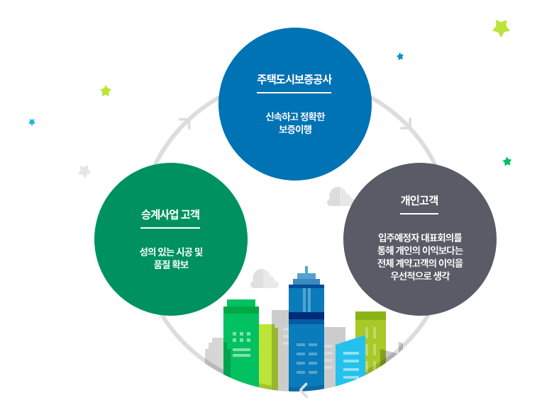 보증사고사업장정보의 성공적인 이행을 위해선 분양계약고객 주택도시보증공사 승계사업자 및 행정기관과의 유기적인 협조관계 및 신뢰가 있을 때 최상의 품질로 완공된 아파트에 입주할 수 있습니다.
