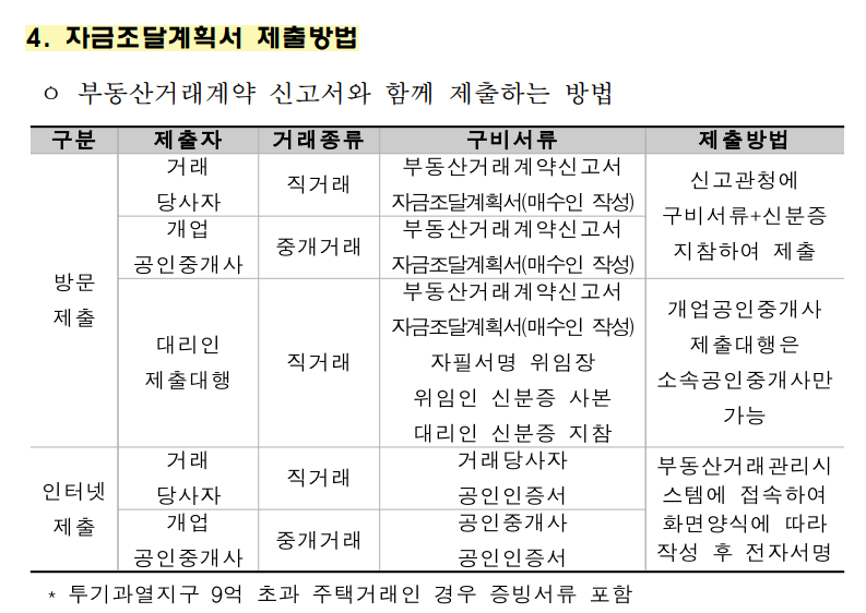 - 자금조달계획서(증빙서류 제출대상인 경우 증빙서류 포함, 이하 같음) :