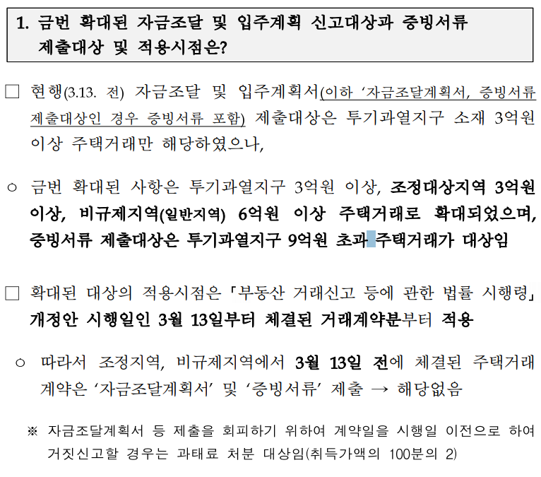 1. 자금조달계획서 제출대상 확대 【주요 개정 내용】 계약일이 3월13일 전인 경우 ⇒ 계약일이 3월13일 이후인 경우 투기과열지구 3억원 이상 주택 투기과열지구 3억원 이상 주택 조정대상지역 3억원 이상 주택 비규제지역 6억원 이상 주택 (투기과열지구 9억 초과 주택 증빙서류 제출) 【부동산 거래신고 등에 관한법률 시행령 제3조제1항】 실제 거래가격이 6억원 이상인 주택(「주택법」 제2조제1호의 주택을 말한다. 이하 이 조에서 같다)과 같은 법 제63조에 따라 지정된 투기과열지구(이하 이 조에서 “투기 과열지구”라 한다) 또는 같은 법 제63조의2에 따라 지정된 조정대상지역에 소재하는 주택으로서 실제 거래가격이 3억원 이상인 주택의 거래계약을 체결한 경우(거래당사자 중 매수인이 법 제3조제1항 단서에 따른 국가등인 경우는 제외한다)에만 적용한다. ㅇ (적용시점) 개정 시행령 시행일(3.13.)부터 체결한 매매계약 (시행일 전에 체결된 매매계약은 해당 없음, 시행령 부칙참조) * 분양·입주권 공급계약 및 전매계약도 자금조달계획서 제출대상 ☞ 자금조달계획서 제출을 회피하기 위하여 계약일을 시행일 전으로 거짓신고하는 경우 취득가액 100분의 2에 해당하는 과태료 부과대상 ㅇ (증빙서류 제출대상) 투기과열지구 9억원 초과 주택거래 계약 에만 적용 ☞ 자금조달계획서 및 증빙서류 또한 실거래 신고와 같이 제출기한은 30일 부동산거래신고법 시행령․시행규칙 개정에 따른 업무처리 안내 - 자금조달계획서 및 증빙서류 관련 개정 /2020년 3월 13일 시행 - 2. 자금조달계획서 작성의무자 ㅇ 자금조달계획서는 매수인의 자금조달 및 입주계획을 확인하기 위한 것으로 매수인이 작성 및 서명ㆍ날인 - 매수인 외의 자가 자금조달계획서를 제출하려는 경우에는 매수인은 25일 이내에 자금조달계획서를 공인중개사 및 대행제출자에게 제공하여 제출 *「부동산 거래신고 등에 관한 법률 시행규칙」제2조제8항 및 제5조제1항 참조 3. 자금조달계획서 서식 작성 ㅇ「부동산 거래신고 등에 관한 법률 시행규칙」 개정에 따라 자금조달 계획서 신고 항목이 구체화되어 서식이 변경됨(시행규칙 별지 제1호의2 서식) 【주요 개정 내용】 구 분 기존 서식 (계약일이 3.13. 전인 경우) 변경 서식 (계약일이 3.13. 이후인 경우) 증여· 상속 제공자 관계추가 ⑤ 증여ㆍ상속 등 원 ④ 증여ㆍ상속 원 [ ]부부 [ ]직계존비속 (관계: ) [ ]그 밖의 관계 ( ) 현금 등 자산종류 명시 ⑥ 현금 등 기타 원 ⑤ 현금 등 그 밖의 자금 원 [ ]보유 현금 [ ]그 밖의 자산 (종류: ) 금융기관 대출액 세부구분 ⑧ 금융기관 대출액 원 ⑧ 금융기관 대출액 합계 원 주택담보대출 원 신용대출 원 그 밖의 대출 원 (대출종류: ) 그 밖의 차입금 제공자 관계추가 ⑪ 그 밖의 차입금 원 ⑪ 그 밖의 차입금 원 [ ]부부 [ ]직계존비속 (관계: ) [ ]그 밖의 관계 ( ) 조달자금 지급방식 < 신 설 > 총 거래금액 원 ⑯ 계좌이체 등 금액 원 ⑰ 보증금ㆍ대출 승계 등 금액 원 ⑱ 현금 및 그 밖의 지급방식금액 원 지급사유( ) 4. 자금조달계획서 제출방법 ㅇ 부동산거래계약 신고서와 함께 제출하는 방법 구분 제출자 거래종류 구비서류 제출방법 방문 제출 거래 당사자 직거래 부동산거래계약신고서 자금조달계획서(매수인 작성) 신고관청에 구비서류+신분증 지참하여 제출 개업 공인중개사 중개거래 부동산거래계약신고서 자금조달계획서(매수인 작성) 대리인 제출대행 직거래 부동산거래계약신고서 자금조달계획서(매수인 작성) 자필서명 위임장 위임인 신분증 사본 대리인 신분증 지참 개업공인중개사 제출대행은 소속공인중개사만 가능 인터넷 제출 거래 당사자 직거래 거래당사자 공인인증서 부동산거래관리시 스템에 접속하여 화면양식에 따라 작성 후 전자서명 개업 공인중개사 중개거래 공인중개사 공인인증서 * 투기과열지구 9억 초과 주택거래인 경우 증빙서류 포함 ㅇ 부동산거래계약 신고 후 매수인 별도 제출하는 방법 < 부동산거래신고 및 자금조달계획서 제출 세부안내 > 1) 개업공인중개사 중개거래 ㅇ 필요서류 - 부동산거래계약 신고서 : 개업공인중개사(공동중개인 경우 공동) 작성 - 자금조달계획서(증빙서류 제출대상인 경우 증빙서류 포함, 이하 같음) : 매수인이 작성하여 25일 이내 개업공인중개사에게 제공 또는 매수인 별도 (대리인) 제출도 가능 방문 제출 인터넷 제출 해당 서류를 관할 신고관청에 직접 방문하여 제출. 제출 대행을 할 경우, 대행하는 사람은 매수인의 자필서명 위임장과 매수인의 신분증 사본 제출(매수인 또는 대행인 신분증 지참) 부동산 거래관리 시스템 (http://rtms.molit.go.kr) 접속 → 시군구별 거래신고사이트 접속 → 매수인 공인인증서 로그인 → 신고 이력조회를 통해 자금조달 계획서 작성 후 전자서명 5. 신고필증 교부 ㅇ 신고필증은 소유권이전등기 필수서류로 부동산 거래신고서와 자금조달 계획서가 모두 제출되어야 발급 → 가급적 동시에 제출할 것을 권장 ㅇ 방문 제출방법 - 개업공인중개사가 신고관청에 실거래 신고서와 자금조달계획서 제출(소속 공인중개사에게 신고서 제출 위임 가능) * 자금조달계획서를 매수인이 별도 