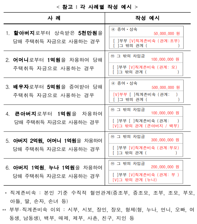 ㅇ (작성방법) 개정된 자금조달계획서 중 ‘증여 상속’, ‘현금 등 그 밖의 자금’, ‘그 밖의 차입금’ 칸에는 자금 제공자의 관계를 기재