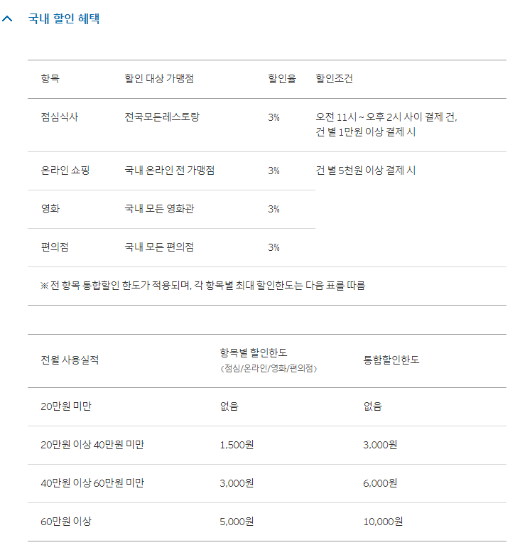 - 전월 사용실적 : 해당 카드로 전월 1일부터 말일까지 국내, 해외 이용금액이 전월 사용실적이 되며, 전월 사용실적에 따라 월간 통합할인한도가 차등 적용됩니다.