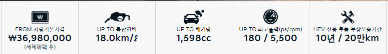 ※ 상기 사양 구성은 차급 및 선택 사양에 따라 다르게 적용됩니다. ※ 본 인쇄물에 수록된 제품 색상 및 이미지는 실제와 다를 수 있습니다. ※ 당사 생산 상황 및 정부정책(개별소비세율 변동) 등으로 출고 시점에 따른 차량 구매가격의 차이가 있을 수 있습니다. 터보 하이브리드 2021년 5월 3일 기준(단위 : 원) ■파워트레인 : 스마트스트림 터보 하이브리드, 스마트스트림 6AT, 44.2kW 구동 모터, 랙 구동형 전동식 파워스티어링(R-MDPS), 주행모드 통합제어 시스템 ■첨단 운전자 보조 (ADAS) : 전방 충돌방지 보조(차량/보행자/사이클리스트), 차로 이탈방지 보조, 운전자 주의 경고(전방 차량 출발 알림 기능 포함), 하이빔 보조, 차로 유지 보조 ■안전 : 9에어백(운전석/동승석 어드밴스드, 운전석 무릎, 전복감지 커튼, 앞좌석/뒷좌석 사이드), 전/후방 주차 거리 경고, VSM, 다중 충돌방지 자동 제동 시스템, 경사로 밀림방지장치, 급제동 경보 시스템, 개별 타이어 공기압 경보 시스템, 유아용 시트 고정 장치, 타이어 임시 수리장치 ■외장 : 225/55 R17 타이어&하이브리드 전용 전면가공 휠, 프로젝션 LED 헤드램프, LED 턴 시그널(프론트/리어), LED DRL, LED 리어 콤비네이션램프, LED보조제동등, LED 리피터 일체형 아웃사이드 미러(전동접이, 전동조절, 열선, 퍼들램프), 도어손잡이 조명(프론트), 에어로타입 와이퍼, 윈드쉴드/앞좌석 이중접합 차음 글라스, 윈드쉴드 자외선차단 글라스 ■내장 : 블랙 원톤 또는 브라운 투톤 인테리어 선택 가능, 슈퍼비전 클러스터(4.2인치 칼라 TFT LCD),가죽 스티어링 휠, LED 실내등(맵램프, 룸램프, 러기지램프), 전자식 룸미러(ECM) , 슬라이딩 선바이저(거울, LED조명), 도어스커프 ■시트 : 가죽시트, 앞좌석 파워시트, 동승석 워크인 디바이스, 앞좌석/뒷좌석 열선시트, 운전석 통풍시트, 앞좌석 전동식 허리지지대, 뒷좌석 센터 암레스트 , 스키쓰루, 앞좌석 시트벨트 높이조절장치 ■편의 : 버튼시동 스마트키 시스템(원격시동 포함), 스마트 트렁크, 하이패스 자동결제 시스템, 전자식 파킹브레이크(EPB, 오토홀드), 전자식 변속 다이얼(SBW), 패들 쉬프트, 후방 모니터, 크루즈 컨트롤, 오토 라이트 컨트롤, 레인센서, 열선 스티어링 휠, 수동식 틸트&텔레스코픽 스티어링 휠, 독립제어 풀오토 에어컨(운전석, 동승석), 고성능 에어컨 필터, 공기청정시스템(미세먼지 센서 포함), 뒷좌석 에어벤트, 앞좌석/뒷좌석 세이프티 파워윈도우, 뒷좌석 USB 단자(충전용), 파워아웃렛 ■ 인포테인먼트 : 8인치 디스플레이 오디오, 인포테인먼트/공조 전환 조작계, 8스피커, 스티어링 휠 오디오 리모컨, 블루투스 핸즈프리, USB 단자(데이터리딩용) ▶ 노블레스 라이트 기본 품목 외 ■안전 : 후방 주차 충돌방지 보조 ■ 외장 : 새틴 크롬 가니쉬 (라디에이터 그릴 V자, 전/후면 범퍼 하단부), 블랙하이그로시 (전/후면 범퍼 하단부), 다크 스테인리스 몰딩(도어 상단) ■ 내장 : 파노라믹 커브드 디스플레이, 슈퍼비전 클러스터(12.3인치 풀사이즈 칼라 TFT LCD) ■편의 : 서라운드뷰 모니터, 후측방 모니터, 원격 스마트 주차 보조, 스마트폰 무선충전 시스템, 뒷좌석 측면 수동 선커튼, 동승석 통풍시트 ■인포테인먼트 : 12.3인치 UVO 내비게이션, 내비게이션 무선 업데이트 트 림 주 요 기 본 품 목 선 택 품 목 3,929만 3,698만 4,287만 파노라마 선루프 드라이브 와이즈 HUD 팩 +스마트 커넥트 메리디안 프리미엄 사운드 전자제어 서스펜션 컴포트 프리미엄 스타일 내비게이션 팩 ▶ 노블레스 기본 품목 외 ■안전 : 후측방 충돌방지 보조, 후방 교차 충돌방지 보조, 안전 하차 보조 ■ 외장 : 245/45 R18 미쉐린 타이어&전면가공 휠, 순차점등 턴 시그널(프론트/리어), 다이내믹 웰컴 라이트, 후진 가이드 램프, 뒷좌석 이중접합 차음 글라스 ■ 내장 : 블랙 원톤, 브라운 투톤 또는 샌드 베이지 투톤 인테리어 선택 가능, 고급 우드그레인 내장재, 앰비언트 라이트, 인조가죽 감싸기&리얼 스티치(크래쉬패드, 도어트림), 나파가죽 혼커버, 메탈 페달 ■시트 : 퀼팅 나파 가죽 시트(도어트림 퀼팅 포함), 옷걸이형 헤드레스트 ■편의 : 전자식 차일드락, 전동식 세이프티 파워 트렁크 구 분 파노라마 선루프 컴포트 스타일 드라이브 와이즈 HUD팩 + 스마트 커넥트 메리디안 프리미엄 사운드 전자제어 서스펜션 내비게이션팩 라이트 노블레스 시그니처 120만 120만 80만 150만 기본 기본 - 70만 70만 - 70만 70만 - 90만 90만 내비게이션팩 적용 시 선택가능 - 85만 85만 - 160만 160만 110만 110만 110만 100만 100만 기본 패키지 옵션 세 부 사 양 전방 충돌방지 보조(교차로 대향차, 교차 차량, 측방 접근차, 추월시 대향차, 회피 조향 보조 기능 포함), 후측방 충돌방지 보조, 후방 교차 충돌방지 보조, 스마트 크루즈 컨트롤 (정차 및 재출발, 운전스타일 연동 기능 포함), 내비게이션 기반 스마트 크루즈 컨트롤 (고속도로/자동차전용도로 內 안전구간, 곡선로, 진출입로), 드라이브 와이즈 고속도로 주행 보조2 (차로변경 보조 기능 포함), 안전 하차 보조, 전자식 차일드락, 후석 승객 알림 전방 충돌방지 보조(교차로 대향차, 교차 차량, 측방 접근차, 추월시 대향차, 회피 조향 보조 기능 