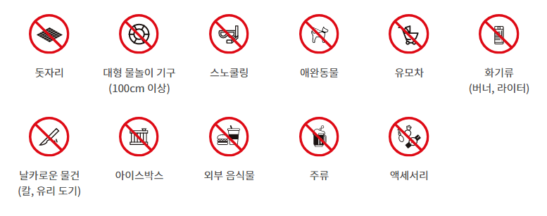 - 안전하고 깨끗한 파크 이용을 위하여 모든 음식물은 반입을 제한하고 있습니다.