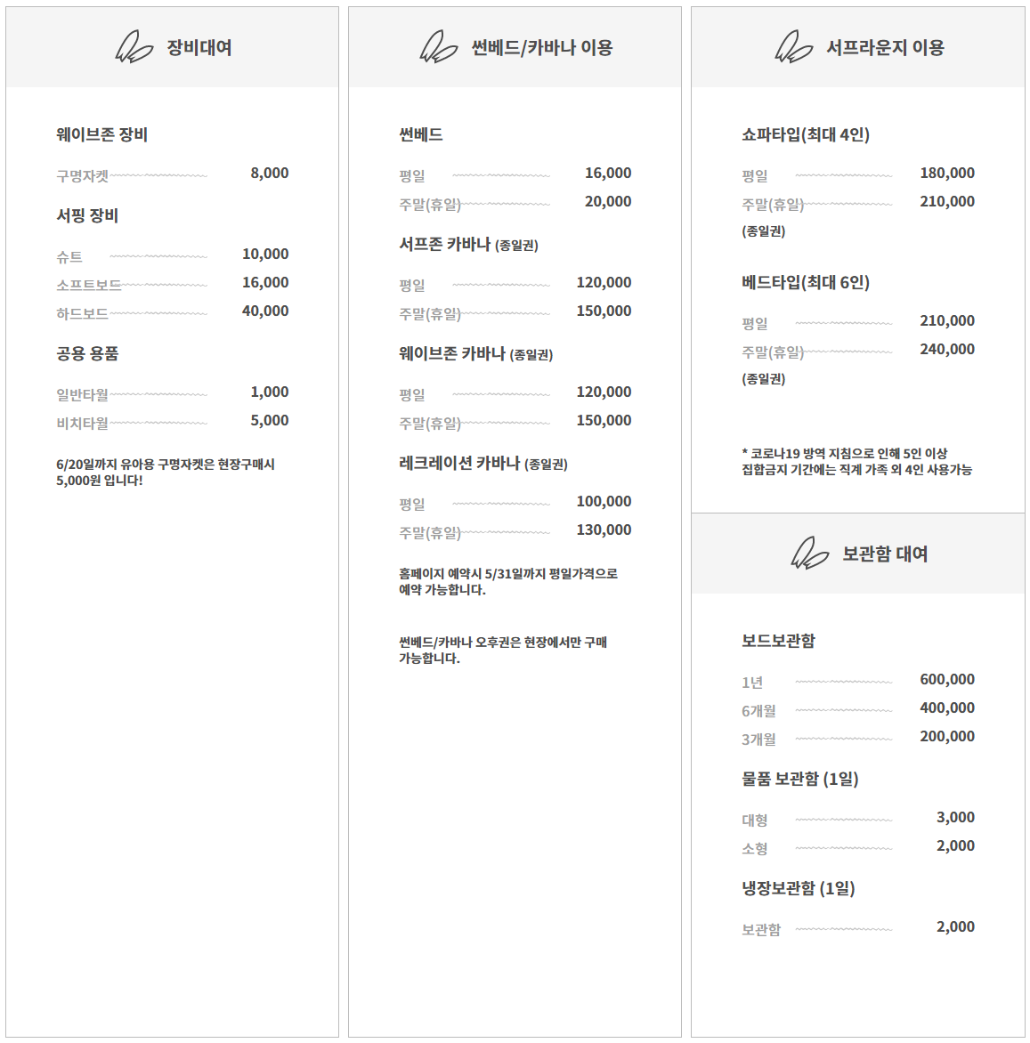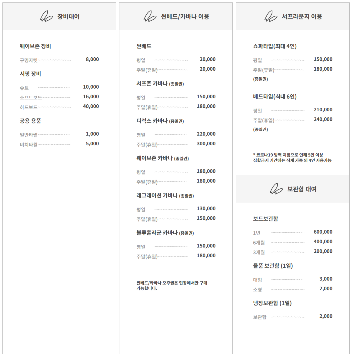 - 서핑존의 서핑이용은 소인이라도 신장 130cm 미만은 안전상의 이유로 이용이 불가합니다.
