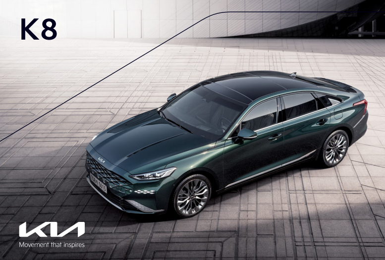 2022 가격표 다운로드 제작년월일 05/02 ・본 인쇄물에 수록된 사진의 색상은 인쇄 등 제작 과정을 거치며 실제 차량의 색상과 다소 차이가 발생할 수 있습니다. ・내비게이션상에 표시되는 기능과 정보는 내비게이션 업데이트 시점에 따라 상이할 수 있습니다. ・주의사항 : 안전운행을 위하여 출고 시 제공되는 사용설명서 내용을 반드시 숙지하시고 운행하시기 바랍니다. ・본 인쇄물은 환경보호를 위해 분리수거 후 재활용이 가능합니다. ・고객센터 : 080-200-2000 ・SK-KM-2.2 인쇄물 제작 시점에 따라 수록 내용과 실제 판매 모델 간에 차이가 발생할 수 있으며, 사양의 일부가 협력사 사정 등으로 불가피하게 변경될 수 있습니다. 또한 인쇄물에 수록된 사진에는 선택사양이 적용된 경우가 있으므로 차량 구입 시 해당월의 가격표를 반드시 참고하시고 영업직 사원의 안내를 받으시기 바랍니다. 기아는 전국 어디서나 동일한 가격과 조건으로 고객님과의 신뢰를 지키겠습니다. K8 본 PDF 파일은 참고용입니다. 제작 시점에 따라 실제 판매모델과 차이가 있을 수 있으므로, 차량 구입 시에는 반드시 해당월의 가격표를 참고하시고 영업직 사원의 안내를 받으시기 바랍니다. 낯설고, 어색하고, 강렬하고. 모든 새로움은 그렇게 시작합니다. K8과 함께하는 모든 길이 당신의 일상에 새로운 영감이 되길 바랍니다. The Outstanding K8 참고용 PDF _ 2022. 5. 2 참고용 PDF _ 2022. 5. 2 Movement that inspires ‘이동과 움직임’은 인류 진화의 기원이자 영감의 원천입니다. 우리는 늘 이동하고 움직이며, 새로운 곳을 찾고, 새로운 사람들을 만나, 새로운 경험을 하며 진화해 왔기 때문입니다. 이제 기아는 더 나은 자동차와 서비스를 통해 고객에게 새로운 이동 경험을 제공하고 삶에 신선한 영감을 불어넣으려고 합니다. 기아의 혁신적인 성능과 공간, 편리하고 의미 있는 서비스는 다양한 활동을 가능하게 만들어 삶의 또 다른 진보를 이끌어낼 것입니다. 3.5 가솔린 _ 오로라 블랙 펄(ABP) / 상기 사양구성은 트림, 엔진 및 선택 사양에 따라 다르게 적용됩니다. 참고용 PDF _ 2022. 5. 2 참고용 PDF _ 2022. 5. 2 3.5 가솔린 _ 그래비티 블루(B4U) / 상기 사양구성은 트림, 엔진 및 선택 사양에 따라 다르게 적용됩니다. K8은 새로운 차명에 걸맞은 혁신적이고 고급스러운 디자인을 선보입니다. 외관 전체를 감싸는 디자인 요소 간의 대비와 조화로움은 기아의 새로운 디자인 정체성을 한눈에 확인 시켜 줍니다. 새로운 기아의 첫 세단이자 새로운 세대를 여는 첫 번째 모델인 K8은 우아하면서도 당당한 존재감으로 여러분들의 일상 속에서 밝게 빛날 것입니다. The Outstanding Design 참고용 PDF _ 2022. 5. 2 참고용 PDF _ 2022. 5. 2 자동차의 디자인은 그저 아름다워야 하는 것이 아니라 함께 하는 이의 삶을 담아낼 수 있어야 합니다. 물 위를 달리는 고급 요트에서 모티브를 얻은 패스트백 타입 실루엣은 역동적인 인상을 남기고 매끈하게 다듬어진 사이드 캐릭터 라인은 당신의 고급스러운 취향과 감성을 보여줍니다. K8의 혁신적인 아름다움이 디자인을 넘어 하나의 새로운 라이프가 되는 순간입니다. _ 그래비티 블루(B4U) 3.5 가솔린 AWD _ 스틸 그레이(KLG) / 상기 사양구성은 트림, 엔진 및 선택 사양에 따라 다르게 적용됩니다.3.5 가솔린 참고용 PDF _ 2022. 5. 2 참고용 PDF _ 2022. 5. 2 스포티하고 미래지향적인 디자인이 일상을 새로운 영감으로 채우다 K8의 디자인은 오늘의 패러다임에 머물러 있기보다 미래의 모빌리티를 눈앞에서 선보입니다. 범퍼와 그릴을 일체형으로 디자인한 신선한 발상은 낯설지만 매력적인 감성으로 다가오고, 패스트백 바디와 완벽하게 조화된 모습은 스포티함을 넘어 K8만의 새로운 클래스를 완성합니다. 3.5 가솔린 _ 그래비티 블루(B4U) / 상기 사양구성은 트림, 엔진 및 선택 사양에 따라 다르게 적용됩니다. 참고용 PDF _ 2022. 5. 2 참고용 PDF _ 2022. 5. 2 아름다운 스토리에 여운을 남기는 것, 예술 작품의 완성도를 더하는 것은 끝까지 균형감과 긴장감을 잃지 않는 마지막 순간에 있습니다. 측면에서부터 이어져 오는 단단한 볼륨감을 날렵하게 마무리하는 트렁크 리드와 와이드하면서도 비례감 있게 빛나는 리어 램프, 간결하고 인상적인 디자인의 범퍼 가니쉬는 극적인 아름다움으로 K8만의 클래스를 기억하게 합니다. 3.5 가솔린 AWD _ 스노우 화이트 펄(SWP) / 상기 사양구성은 트림, 엔진 및 선택 사양에 따라 다르게 적용됩니다. 참고용 PDF _ 2022. 5. 2 참고용 PDF _ 2022. 5. 2 자동차 공간에 대한 사람들의 바람은 기술의 발전이나 트렌드에 따라 끊임없이 변화해 왔습니다. 하지만 정답이 없기 때문에 끊임없이 새로운 답을 찾아낼 수 있습니다. K8은 사용자를 중심에 둔 간결하고 직관적인 디자인과 인체공학적인 설계로 공간과 사람, 기술과 사람 사이에 ‘편안함'과 '편리함'이라는 두 가지 정답만을 남겼습니다. The Outstanding Space 3.5 가솔린 _ 오로라 블랙 펄(ABP) / 상기 사양구성은 트림, 엔진 및 선택 사양에 따라 다르게 적용됩니다. 참고용 PDF _ 2022. 5. 2 참고용 PDF _ 2022. 5. 2 이곳은 당신의 일상생활이 그대로 이어지는 공간이기에 자동차라는 한계에 머물지 않고 호텔의 고