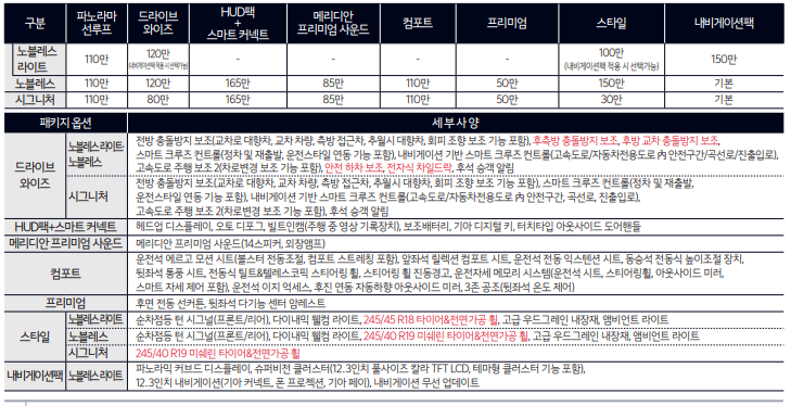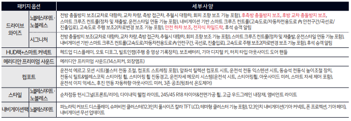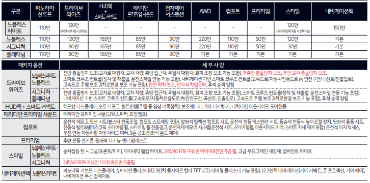 터보 하이브리드 (단위 : 원) 트 림 판매가격 개별소비세 3.5% 가격 주 요 기 본 품 목 선택품목 노블레스 라이트 3,953만 친환경차 세제혜택 후 3,810만 3,881만 친환경차 세제혜택 후 3,738만 •파워트레인 : 스마트스트림 터보 하이브리드, 스마트스트림 6AT, 44.2kW 구동 모터, 랙 구동형 전동식 파워스티어링(R-MDPS), 주행모드 통합제어 시스템 •첨단 운전자 보조(ADAS) : 전방 충돌방지 보조(차량/보행자/사이클리스트), 차로 이탈방지 보조, 운전자 주의 경고(전방 차량 출발 알림 기능 포함), 하이빔 보조, 차로 유지 보조 •안전 : 9에어백(운전석/동승석 어드밴스드, 운전석 무릎, 전복감지 커튼, 앞좌석/뒷좌석 사이드), 전/후방 주차 거리 경고, VSM, 다중 충돌방지 자동 제동 시스템, 경사로 밀림방지장치, 급제동 경보 시스템, 개별 타이어 공기압 경보 시스템, 유아용 시트 고정 장치, 타이어 임시 수리장치 •외장 : 225/55 R17 타이어&하이브리드 전용 전면가공 휠, 프로젝션 LED 헤드램프, LED 턴 시그널(프론트/리어), LED DRL, LED 리어 콤비네이션램프, LED보조제동등, LED 리피터 일체형 아웃사이드 미러(전동접이, 전동조절, 열선, 퍼들램프), 도어손잡이 조명(프론트), 에어로타입 와이퍼, 윈드쉴드/앞좌석 이중접합 차음 글라스, 윈드쉴드 자외선차단 글라스 •내장 : 블랙 원톤 또는 브라운 투톤 인테리어 선택 가능, 슈퍼비전 클러스터(4.2인치 칼라 TFT LCD), 가죽 스티어링 휠, LED 실내등(맵램프, 룸램프, 러기지램프), 전자식 룸미러(ECM), 슬라이딩 선바이저(거울, LED조명), 도어스커프 •시트 : 가죽시트, 앞좌석 파워시트, 동승석 워크인 디바이스, 앞좌석/뒷좌석 열선시트, 운전석 통풍시트, 앞좌석 전동식 허리지지대, 뒷좌석 센터 암레스트, 스키쓰루, 앞좌석 시트벨트 높이조절장치 •편의 : 버튼시동 스마트키 시스템(원격시동 포함), 스마트 트렁크, 하이패스 자동결제 시스템, 전자식 파킹브레이크(EPB, 오토홀드), 전자식 변속 다이얼(SBW), 패들 쉬프트, 후방 모니터, 크루즈 컨트롤, 오토 라이트 컨트롤, 레인센서, 열선 스티어링 휠, 수동식 틸트&텔레스코픽 스티어링 휠, 독립제어 풀오토 에어컨(운전석/동승석), 고성능 에어컨 필터, 공기청정시스템(미세먼지 센서 포함), 뒷좌석 에어벤트, 앞좌석/뒷좌석 세이프티 파워윈도우, 앞좌석/뒷좌석 C타입 USB 단자(충전용), 파워아웃렛, PTC 보조 히터 •인포테인먼트 : 8인치 디스플레이 오디오, 인포테인먼트/공조 전환 조작계, 8스피커, 스티어링 휠 오디오 리모컨, 블루투스 핸즈프리, USB 단자(데이터리딩용) •파노라마 선루프 •드라이브 와이즈 •HUD 팩+ 스마트 커넥트 •메리디안 프리미엄 사운드 •전자제어 서스펜션 •컴포트 •스타일 •내비게이션 팩 노블레스 4,278만 친환경차 세제혜택 후 4,135만 4,200만 친환경차 세제혜택 후 4,057만 ▶ 노블레스 라이트 기본 품목 외 •안전 : 후방 주차 충돌방지 보조 •외장 : 새틴 크롬 가니쉬(라디에이터 그릴 V자, 전/후면 범퍼 하단부), 블랙하이그로시(전/후면 범퍼 하단부), 다크 스테인리스 몰딩(도어 상단), 뒷좌석 이중접합 차음 글라스 •내장 : 파노라믹 커브드 디스플레이, 슈퍼비전 클러스터(12.3인치 풀사이즈 칼라 TFT LCD, 테마형 클러스터 기능 포함) •시트 : 뒷좌석 다기능 센터 암레스트 •편의 : 서라운드뷰 모니터, 후측방 모니터, 원격 스마트 주차 보조, 스마트폰 무선충전 시스템, 뒷좌석 측면 수동 선커튼, 동승석 통풍시트, 전동식 세이프티 파워 트렁크, 후면 전동 선커튼 •인포테인먼트 : 12.3인치 내비게이션(기아 커넥트, 폰 프로젝션, 기아 페이), 내비게이션 무선 업데이트 시그니처 4,643만 친환경차 세제혜택 후 4,500만 4,558만 친환경차 세제혜택 후 4,415만 ▶ 노블레스 기본 품목 외 •안전 : 후측방 충돌방지 보조, 후방 교차 충돌방지 보조, 안전 하차 보조 •외장 : 245/45 R18 미쉐린 타이어&전면가공 휠, 순차점등 턴 시그널(프론트/리어), 다이내믹 웰컴 라이트, 후진 가이드 램프 •내장 : 블랙 원톤, 브라운 투톤 또는 샌드 베이지 투톤 인테리어 선택 가능, 고급 우드그레인 내장재, 앰비언트 라이트, 인조가죽 감싸기&리얼 스티치(크래쉬패드, 도어트림), 나파가죽 혼커버, 메탈 페달, 스웨이드 내장재(헤드라이닝, 필라트림) •시트 : 퀼팅 나파 가죽 시트(도어트림 퀼팅 포함), 옷걸이형 헤드레스트 •편의 : 전자식 차일드락 구분 파노라마 선루프 드라이브 와이즈 HUD팩+ 스마트 커넥트 메리디안 프리미엄 사운드 전자제어 서스펜션 컴포트 스타일 내비게이션팩 노블레스 라이트 110만 120만 (내비게이션팩 적용 시 선택가능) - - - - 100만 (내비게이션팩 적용 시 선택가능) 150만 노블레스 110만 120만 165만 85만 90만 70만 100만 기본 시그니처 110만 80만 165만 85만 90만 70만 기본 기본 패키지 옵션 세 부 사 양 드라이브 와이즈 노블레스 라이트· 노블레스 전방 충돌방지 보조(교차로 대향차, 교차 차량, 측방 접근차, 추월시 대향차, 회피 조향 보조 기능 포함), 후측방 충돌방지 보조, 후방 교차 충돌방지 보조, 스마트 크루즈 컨트롤(정차 및 재출발, 운전스타일 연동 기능 포함), 내비게이션 기반 스마트 크루즈 컨트롤(고속도로/자동차전용