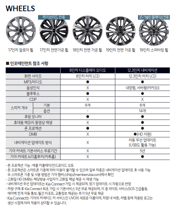 ※ 차량 구매 후 Kia Connect 최초 가입 시 기본 서비스 5년 무료 제공되며, 이 중 라이트 서비스 (SOS 긴급출동, 에어백 전개 자동 통보, 월간 리포트, 교통정보 제공)는 추가 5년 무료 제공