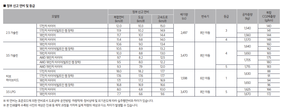 ※ 위 연비는 표준모드에 의한 연비로서 도로상태ㆍ운전방법ㆍ차량적재ㆍ정비상태 및 외기온도에 따라 실 주행연비와 차이가 있습니다.