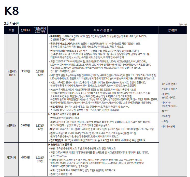 18 K8 K8 2.5 가솔린 (단위 : 원) 트 림 판매가격 개별소비세 3.5% 가격 주 요 기 본 품 목 선택품목 노블레스 라이트 3,380만 3,318만 (-62만) •파워트레인 : 스마트스트림 G2.5 GDI 엔진, 8단 자동변속기, 랙 구동형 전동식 파워스티어링(R-MDPS), 주행모드 통합제어 시스템 •첨단 운전자 보조(ADAS) : 전방 충돌방지 보조(차량/보행자/사이클리스트), 차로 이탈방지 보조, 운전자 주의 경고(전방 차량 출발 알림 기능 포함), 하이빔 보조, 차로 유지 보조 •안전 : 9에어백(운전석/동승석 어드밴스드, 운전석 무릎, 전복감지 커튼, 앞좌석/뒷좌석 사이드), 전/후방 주차 거리 경고, VSM, 다중 충돌방지 자동 제동 시스템, 경사로 밀림방지장치, 급제동 경보 시스템, 개별 타이어 공기압 경보 시스템, 유아용 시트 고정 장치, 타이어 임시 수리장치 •외장 : 225/55 R17 타이어&알로이 휠, 프로젝션 LED 헤드램프, LED 턴 시그널(프론트/리어), LED DRL, LED 리어 콤비네이션램프, LED보조제동등, LED 리피터 일체형 아웃사이드 미러(전동접이, 전동조절, 열선, 퍼들램프), 도어손잡이 조명(프론트), 에어로타입 와이퍼, 윈드쉴드/앞좌석 이중접합 차음 글라스, 윈드쉴드 자외선차단 글라스 •내장 : 블랙 원톤 또는 브라운 투톤 인테리어 선택 가능, 슈퍼비전 클러스터(4.2인치 칼라 TFT LCD), 가죽 스티어링 휠, LED 실내등(맵램프, 룸램프, 러기지램프), 전자식 룸미러(ECM), 슬라이딩 선바이저(거울, LED조명), 도어스커프 •시트 : 가죽시트, 앞좌석 파워시트, 동승석 워크인 디바이스, 앞좌석/뒷좌석 열선시트, 운전석 통풍시트, 앞좌석 전동식 허리지지대, 뒷좌석 센터 암레스트, 스키쓰루, 앞좌석 시트벨트 높이조절장치 •편의 : 버튼시동 스마트키 시스템(원격시동 포함), 스마트 트렁크, 하이패스 자동결제 시스템, 전자식 파킹브레이크(EPB, 오토홀드), 전자식 변속 다이얼(SBW), 패들 쉬프트, 후방 모니터, 크루즈 컨트롤, 오토 라이트 컨트롤, 레인센서, 열선 스티어링 휠, 수동식 틸트&텔레스코픽 스티어링 휠, 독립제어 풀오토 에어컨(운전석/동승석), 고성능 에어컨 필터, 공기청정시스템(미세먼지 센서 포함), 애프터 블로우, 뒷좌석 에어벤트, 앞좌석/뒷좌석 세이프티 파워윈도우, 앞좌석/뒷좌석 C타입 USB 단자(충전용), 파워아웃렛 •인포테인먼트 : 8인치 디스플레이 오디오, 인포테인먼트/공조 전환 조작계, 8스피커, 스티어링 휠 오디오 리모컨, 블루투스 핸즈프리, USB 단자(데이터리딩용) •파노라마 선루프 •드라이브 와이즈 •HUD팩+ 스마트 커넥트 •메리디안 프리미엄 사운드 •컴포트 •프리미엄 •스타일 노블레스 3,640만 3,573만 •내비게이션팩 (-67만) ▶ 노블레스 라이트 기본 품목 외 •안전 : 후방 주차 충돌방지 보조 •외장 : 새틴 크롬 가니쉬(라디에이터 그릴 V자, 전/후면 범퍼 하단부), 블랙하이그로시(전/후면 범퍼 하단부), 다크 스테인리스 몰딩(도어 상단), 뒷좌석 이중접합 차음 글라스 •내장 : 파노라믹 커브드 디스플레이, 슈퍼비전 클러스터(12.3인치 풀사이즈 칼라 TFT LCD, 테마형 클러스터 기능 포함) •편의 : 서라운드뷰 모니터, 후측방 모니터, 원격 스마트 주차 보조, 스마트폰 무선충전 시스템, 뒷좌석 측면 수동 선커튼, 동승석 통풍시트, 전동식 세이프티 파워 트렁크 •인포테인먼트 : 12.3인치 내비게이션(기아 커넥트, 폰 프로젝션, 기아 페이), 내비게이션 무선 업데이트 시그니처 4,005만 3,932만 (-73만) ▶ 노블레스 기본 품목 외 •안전 : 후측방 충돌방지 보조, 후방 교차 충돌방지 보조, 안전 하차 보조 •외장 : 245/45 R18 미쉐린 타이어&전면가공 휠, 순차점등 턴 시그널(프론트/리어), 다이내믹 웰컴 라이트, 후진 가이드 램프 •내장 : 블랙 원톤, 브라운 투톤 또는 샌드 베이지 투톤 인테리어 선택 가능, 고급 우드그레인 내장재, 앰비언트 라이트, 인조가죽 감싸기&리얼 스티치(크래쉬패드, 도어트림), 나파가죽 혼커버, 메탈 페달, 스웨이드 내장재(헤드라이닝, 필라트림) •시트 : 퀼팅 나파 가죽 시트(도어트림 퀼팅 포함), 옷걸이형 헤드레스트 •편의 : 전자식 차일드락 구분 파노라마 선루프 드라이브 와이즈 HUD팩+ 스마트 커넥트 메리디안 프리미엄 사운드 컴포트 프리미엄 스타일 내비게이션팩 노블레스 라이트 110만 120만 (내비게이션팩 적용 시 선택가능) - - - - 100만 (내비게이션팩 적용 시 선택가능) 150만 노블레스 110만 120만 165만 85만 110만 50만 150만 기본 시그니처 110만 80만 165만 85만 110만 50만 30만 기본 패키지 옵션 세 부 사 양 드라이브 와이즈 노블레스 라이트· 노블레스 전방 충돌방지 보조(교차로 대향차, 교차 차량, 측방 접근차, 추월시 대향차, 회피 조향 보조 기능 포함), 후측방 충돌방지 보조, 후방 교차 충돌방지 보조, 스마트 크루즈 컨트롤(정차 및 재출발, 운전스타일 연동 기능 포함), 내비게이션 기반 스마트 크루즈 컨트롤(고속도로/자동차전용도로 內 안전구간/곡선로/진출입로), 고속도로 주행 보조 2(차로변경 보조 기능 포함), 안전 하차 보조, 전자식 차일드락, 후석 승객 알림 시그니처 전방 충돌방지 보조(교차로 대향차, 교차 차량, 측방 접근차, 추월시 대향차, 회피 조향 보조 기능 포함), 스마트 크루즈 컨트롤(정