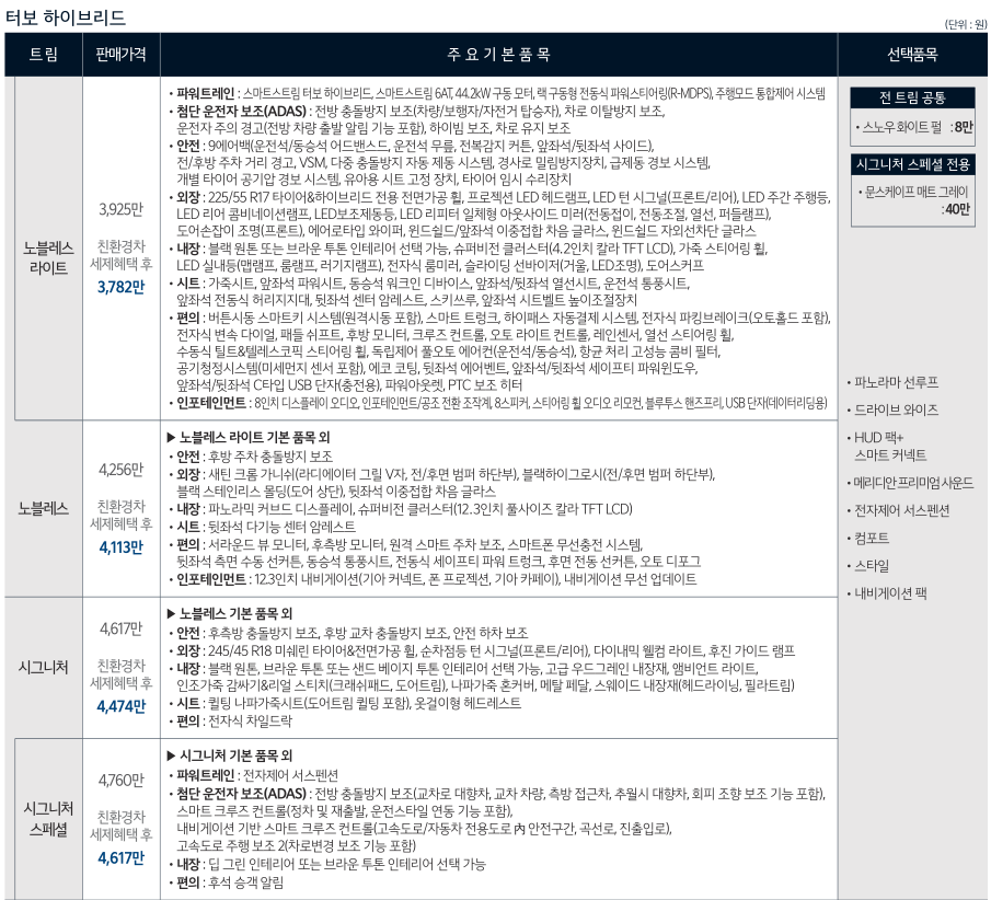 • 편의 : 버튼시동 스마트키 시스템(원격시동 포함), 스마트 트렁크, 하이패스 자동결제 시스템,